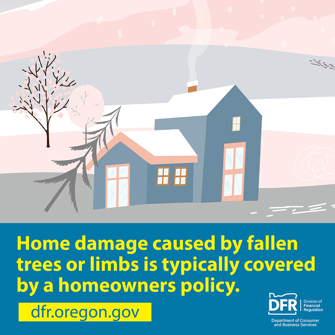 An illustration of snow covering a house, trees, and the ground. The text reads, “Prepare for winter weather by checking your insurance." Visit dfr.oregon.gov